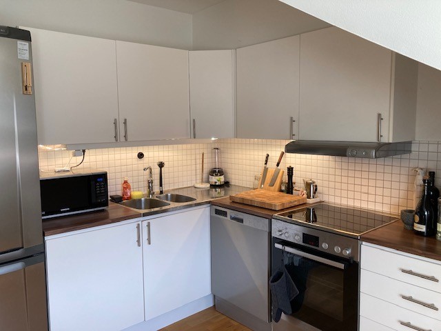 Snyggt kök med diskmaskin och rostfria vitvaror. Fönster ut mot trädgården.