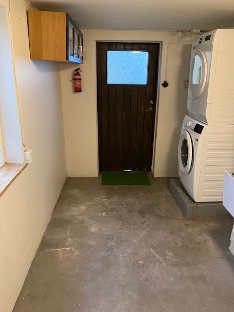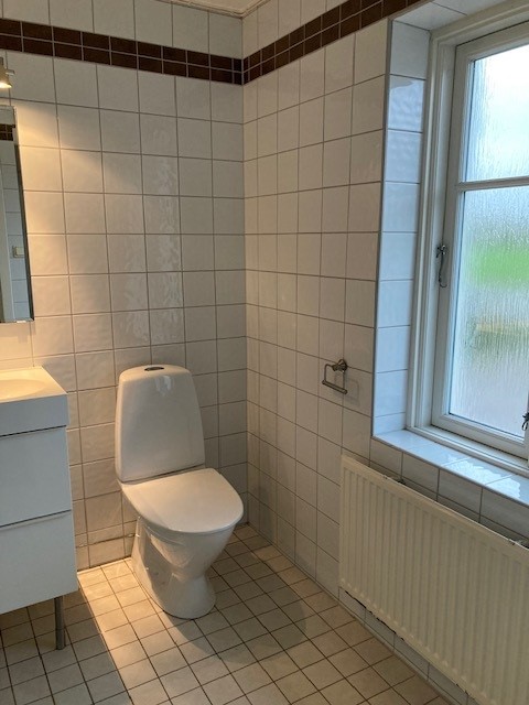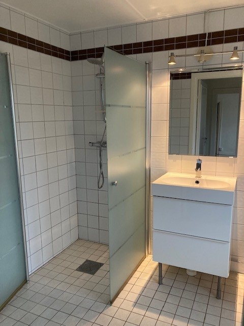 På entréplan finner ni kök, vardagsrum, 2 sovrum (varav det ena är lite mindre) samt helkaklat badrum m dusch.