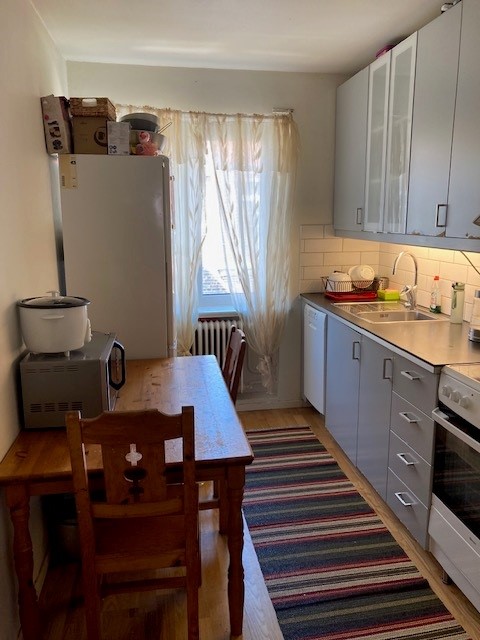 Köket har plats för mindre matbord. Fönster med utsikt ut mot tvärgatan.
